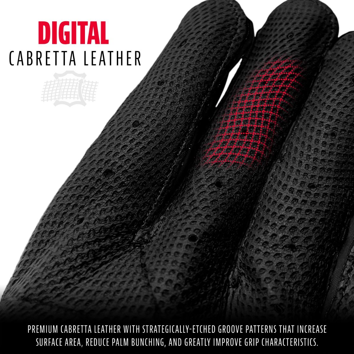 Experience the superior feel of premium Digital Cabretta leather with strategically-etched groove patterns that increase surface area, eliminate palm bunching, and dramatically improve grip characteristics. The one-piece palm design maintains exceptional softness and provides a superior grip in all weather conditions—from scorching summer games to cool spring tournaments.